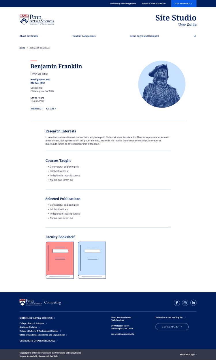 Display course offerings using the integrated PennCourse module, which pulls course information directly from university systems and presents it in a clean format that can be filtered by term, subject, and level.